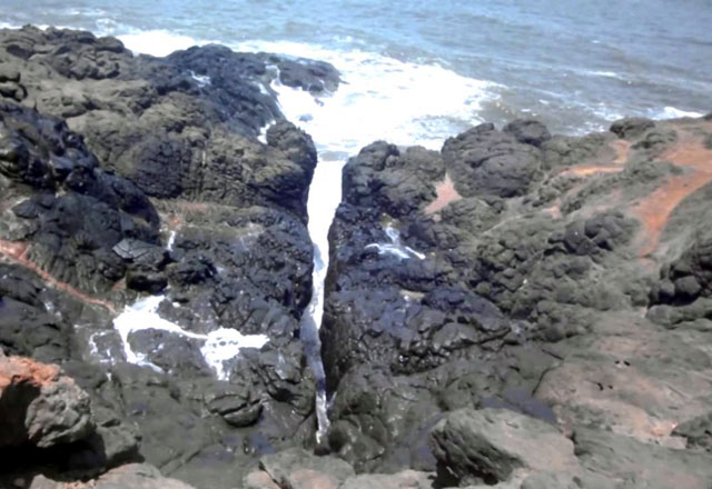 Brahmanghal is a rare natural phenomenon where continous gradation of the rocks by the sea has created a gorge in the black rock patch about 20 feet deep and 1-2 feet wide. The sea water gushes in and a water column rises through this gorge above the rocks upto 20-30ft during high tides. The temple of Uma Maheshwari is located on the same rocky stretch at the start of the way to Bahman Ghal